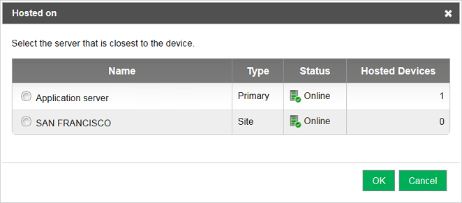 The device record also presents an option for administrators to change this Hosted on value at any time in the future. This allows for a device to be moved from one server to another.