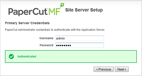 Enter the credentials of a user with administrator access to PaperCut on the primary server.
